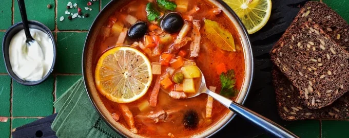 La solyanka è una zuppa densa che è stata cucinata per la prima volta nel XV-XVII secolo. Si ritiene che fosse un piatto contadino – allora la zuppa di pesce veniva cucinata su brodo di carne con l’aggiunta di cavolo, carne, cipolle e cetrioli. Con il tempo, alla ricetta vennero aggiunti capperi, funghi sott’aceto, limone, olive e persino kvas – in questa forma, nel XIX secolo, la densa zuppa iniziò a essere servita nelle taverne delle grandi città. Oggi, ogni padrona di casa prepara il sugo salato a modo suo.