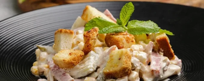 - Mettere in un’insalatiera il prosciutto, la frittata, il mais in scatola, il cetriolo, sale e pepe, aggiungere la maionese e mescolare delicatamente.