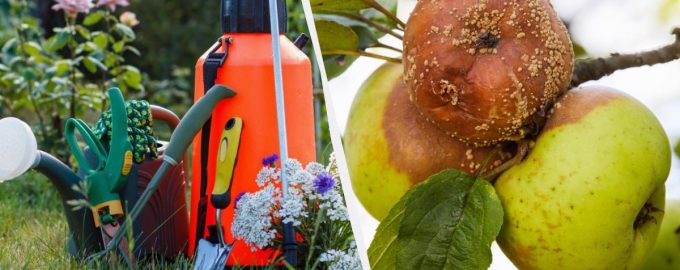 Per mantenere tutte le mele fresche fino al gelo, trattate i meli con una miscela speciale. Come trattare gli alberi da frutto dal marciume della frutta / collage.